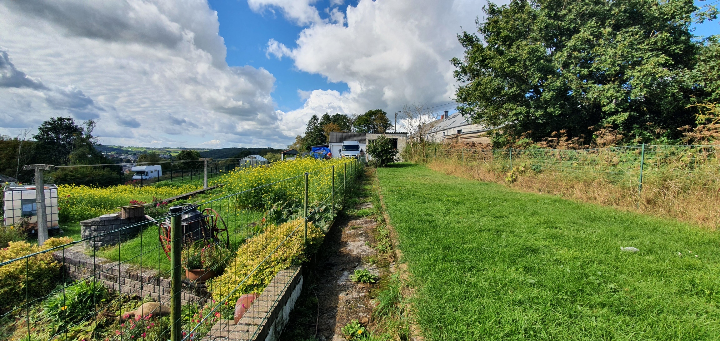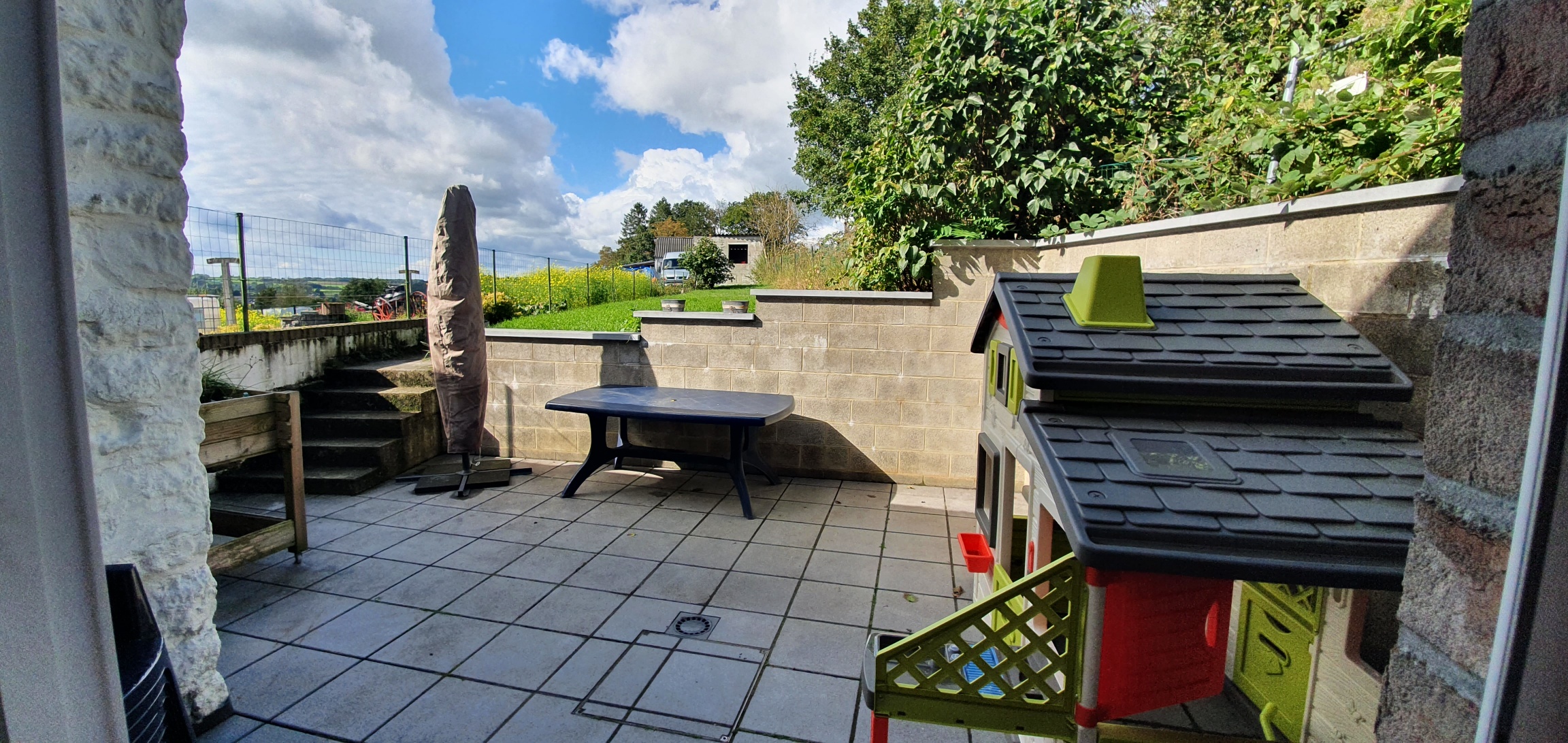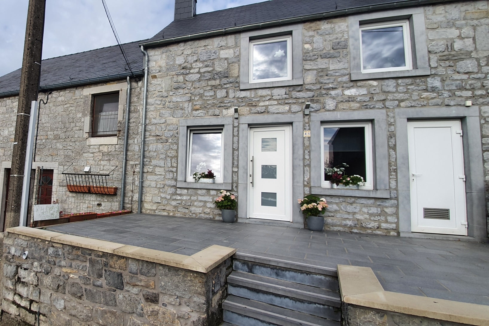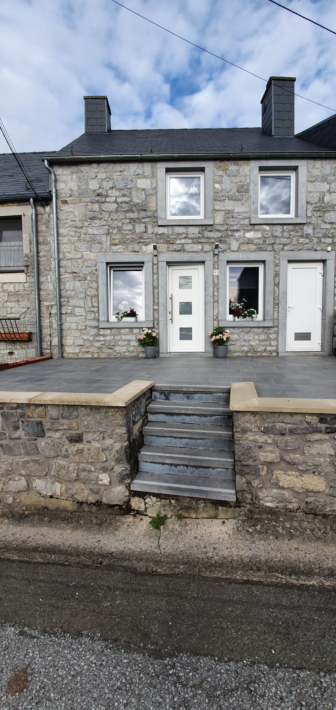 Maison en pierre du pays pourvue d'un rez-de-chaussée, de deux étages d'une terrasse avant et arrière avec jardin, châssis oscillo et porte PVC double vitrage, verre sécurit