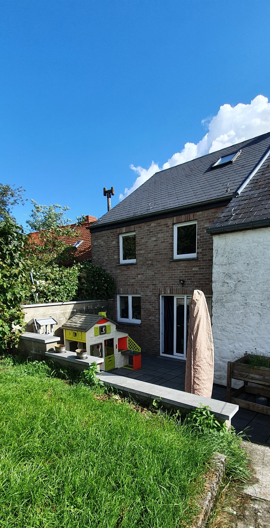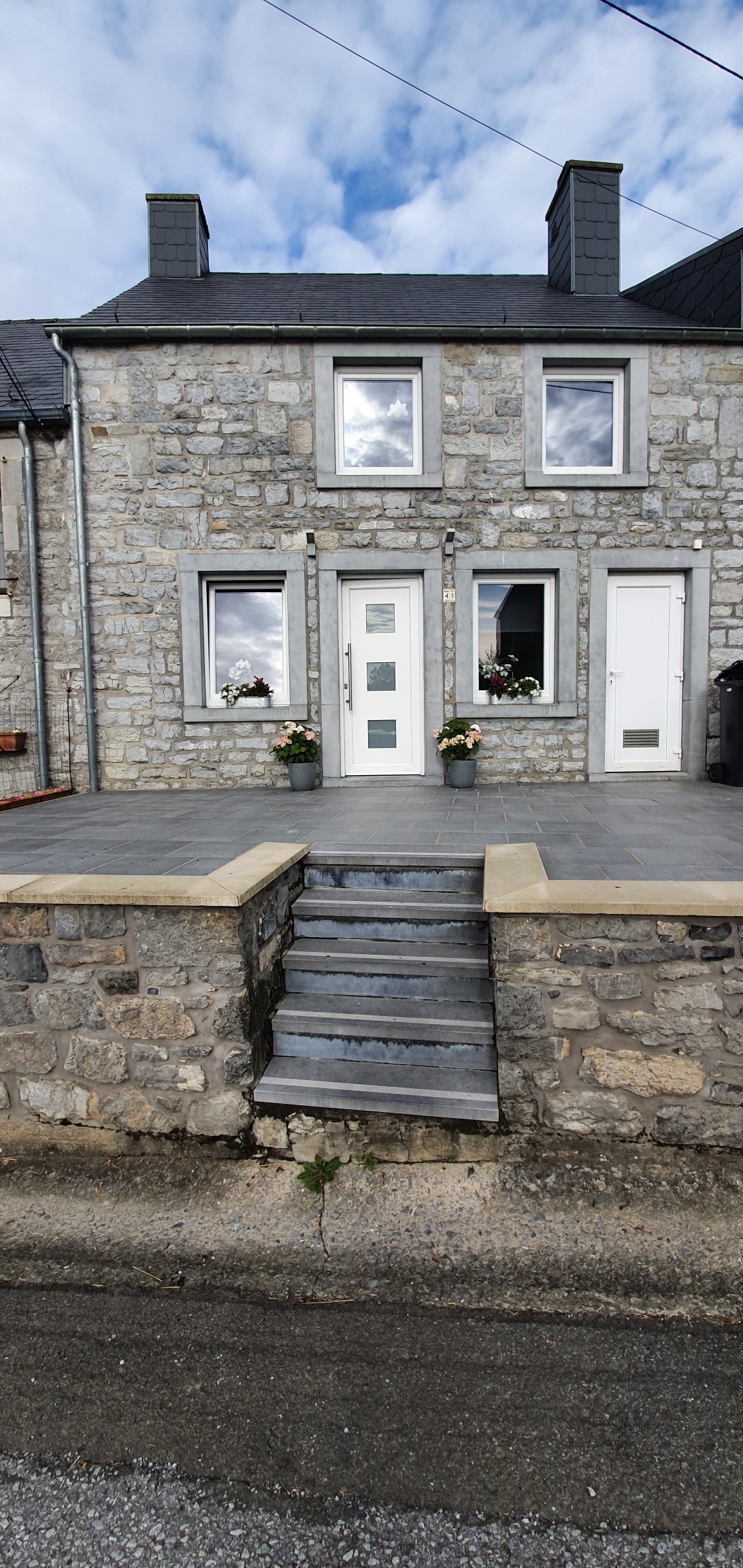Maison en pierre du pays pourvue d'un rez-de-chaussée, de deux étages d'une terrasse avant et arrière avec jardin, châssis oscillo et porte PVC double vitrage, verre sécurit