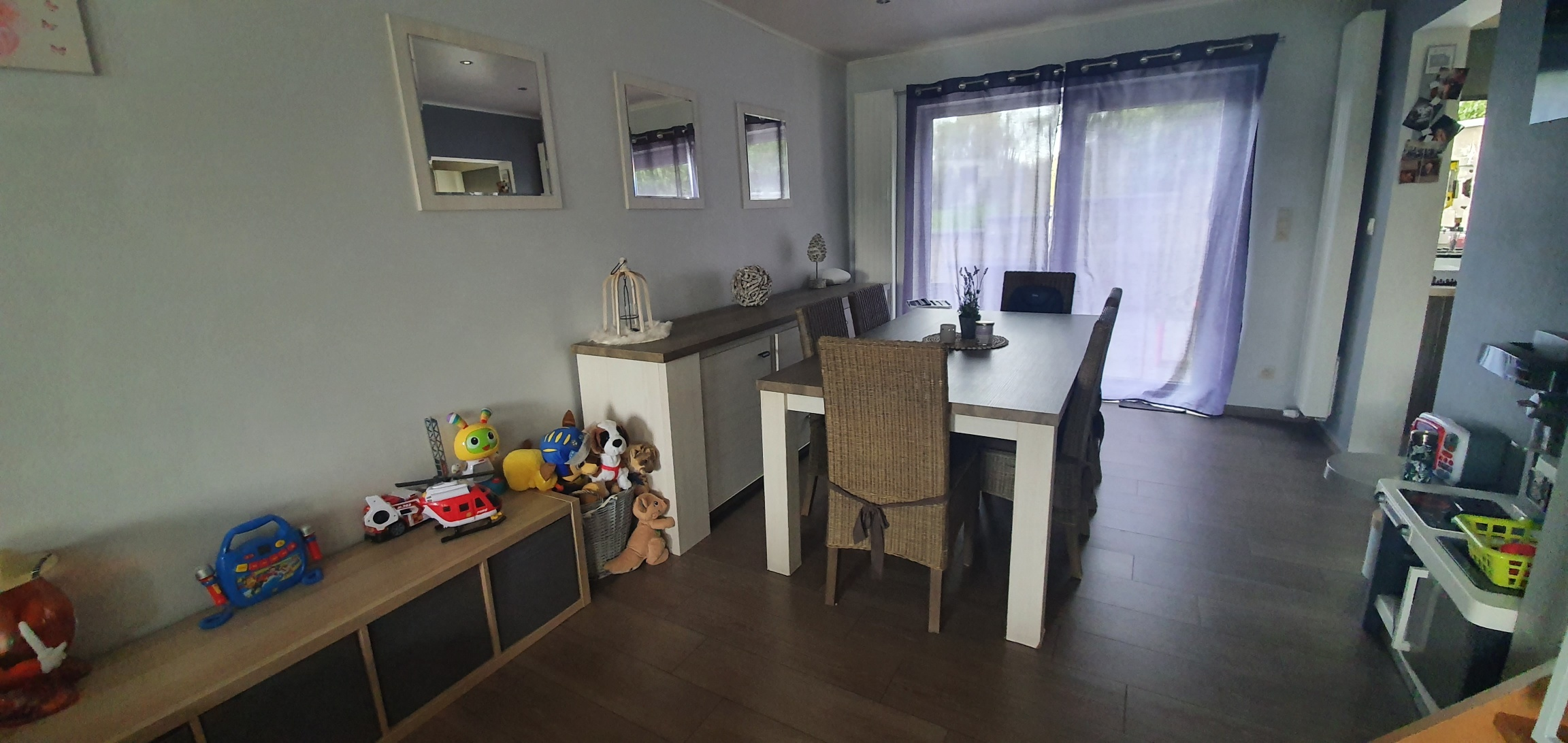 Pièce à vivre conviviale et accueillante dont la baie vitrée arrière laisse filtrer la lumière naturelle et permet d'avoir une vue sur la terrasse arrière.